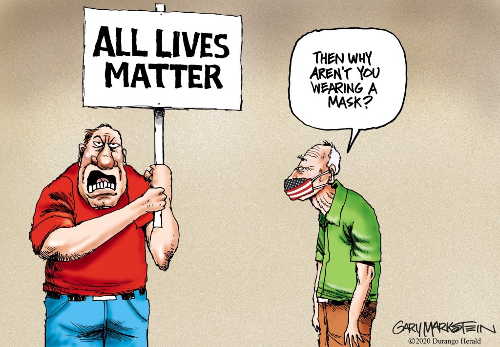 In many ways, I’m helpless, but I’m also lucky. I have a support network. And I’m able to work from home. There are people who are high risk and essential workers who aren’t able to stay home. A person’s refusal to wear a mask could so easily and casually take their lives. What anti-maskers call freedom, I call murder. Yes, murder. Soft language protects denial and those with the blood on their hands.